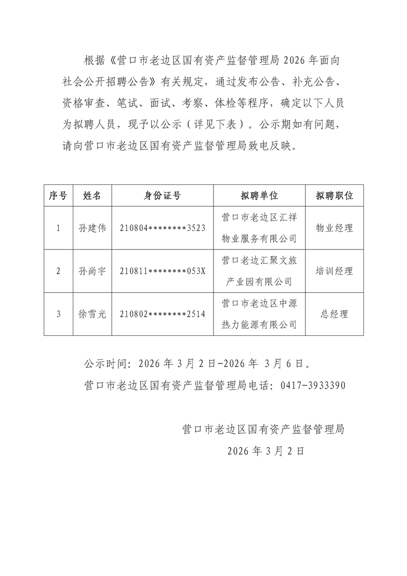 营口市老边区国有资产监督管理局2026年面向社会公开招聘部分拟聘人员公示